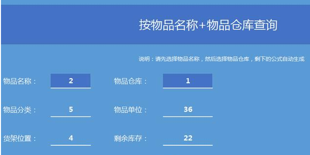 通过在查找表中选择物料名称和仓库,可以通过公式显示这两种情况下的物料详细信息。