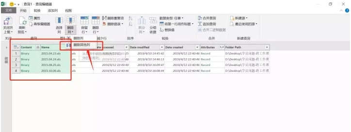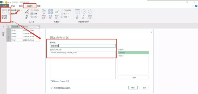 4.再加列-再加自设列-输入新字段读取数据信息内容-自设列计算公式-Excel.workbook(content,true)。