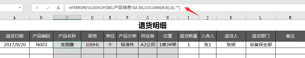 退货明细,按照所列内容输入,灰色底纹的为自动显示计算。