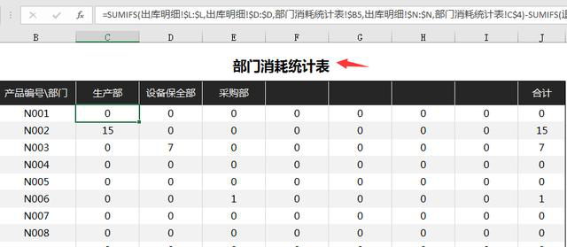 部门消耗统计,该表只需首次使用前录入产品编号及部门,即可统计各部门各种物料的详细消耗情况。