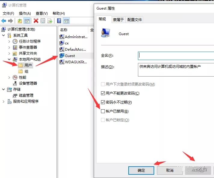 在计算机管理页面中,选择用户帐户和组下的客户。双击鼠标右侧的客户端,在弹出页面上,取消帐户不再使用的选项,然后单击右下方的使用按钮和清晰按钮。这里,第二步已经确定。