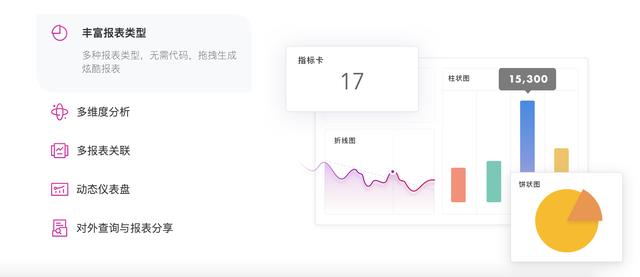 在光流系统中,您可以定制您需要的数据报表,报表类型丰富,包括饼图、直方图、折线图、指示卡等。设置完成后,一旦原始数据更新,相关数据报告将自动更新。