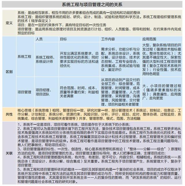为了阐明系统工程与项目管理的关系,作者用表格分析了系统工程与项目管理的定义、区别、共性和相互关系,以供大家探讨和应用。