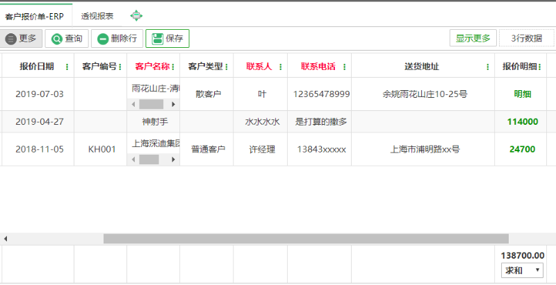 3.保存单据后,可以查看已有的报价单列表,点击报价明细列中的绿色文字,可以查看此笔单据的明细数据。