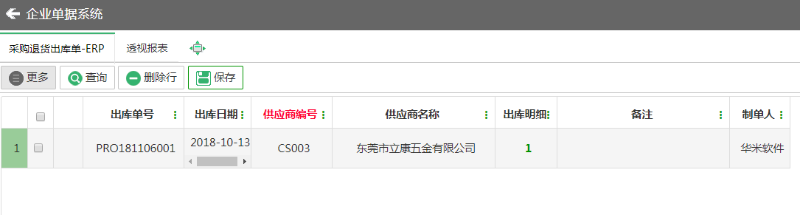 3.保存单据后,可以查看已有的采购退货出库单列表,点击出库明细列中的绿色文字,可以查看此笔单据的明细数据。