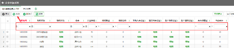 3.保存单据后,可以查看已有的物料库存记录表列表,点击采购入库总量列中的绿色文字,可以查看此笔单据的明细数据。